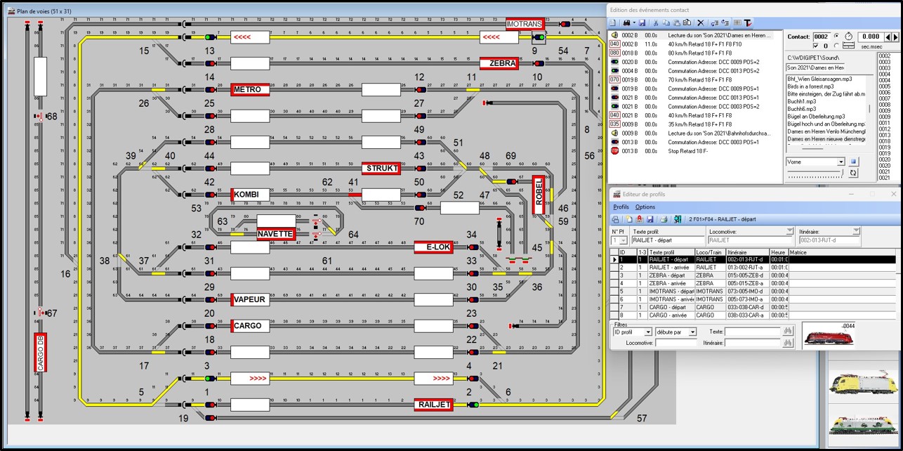 -Le boitier à droite du plan, gère les fonctions de la locomotive sélectionnée (vitesse - sens de marche et accessoires son) lorsque l'on pilote la machine en manuel. Le nom de la machine est indiqué (Railjet) ainsi que son numéro du décodeur (0044). Lors de la programmation des trajets, les sons sont programmés à notre convenance en activant les icônes. Sur certaines locomotives, jusqu'à 16 sons divers (moteur - freins - cabine - sifflet - entrée en gare, etc.) sont proposés.