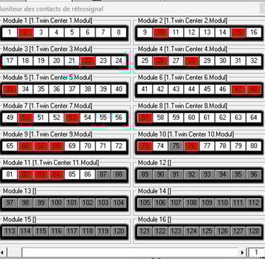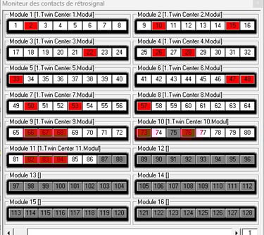 -Les chiffres au dessus des voies représentent les cantons. Un fil électrique alimente cette toute partie de voie et il est connecté avec l'une des bornes du module de rétrosignalisation. Ci-dessous, les modules RTS (12 au total) avec un rouge, le n° de canton qui est occupé.