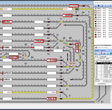 Ce n'est qu'un aperçu car il y a d'autres réglages à effectuer dans une autre fenêtre de cet éditeur comme par exemple, le placement du sens de l'aiguille pour chaque aiguillage, le passage au rouge du feu lorsque la rame est passée etc.